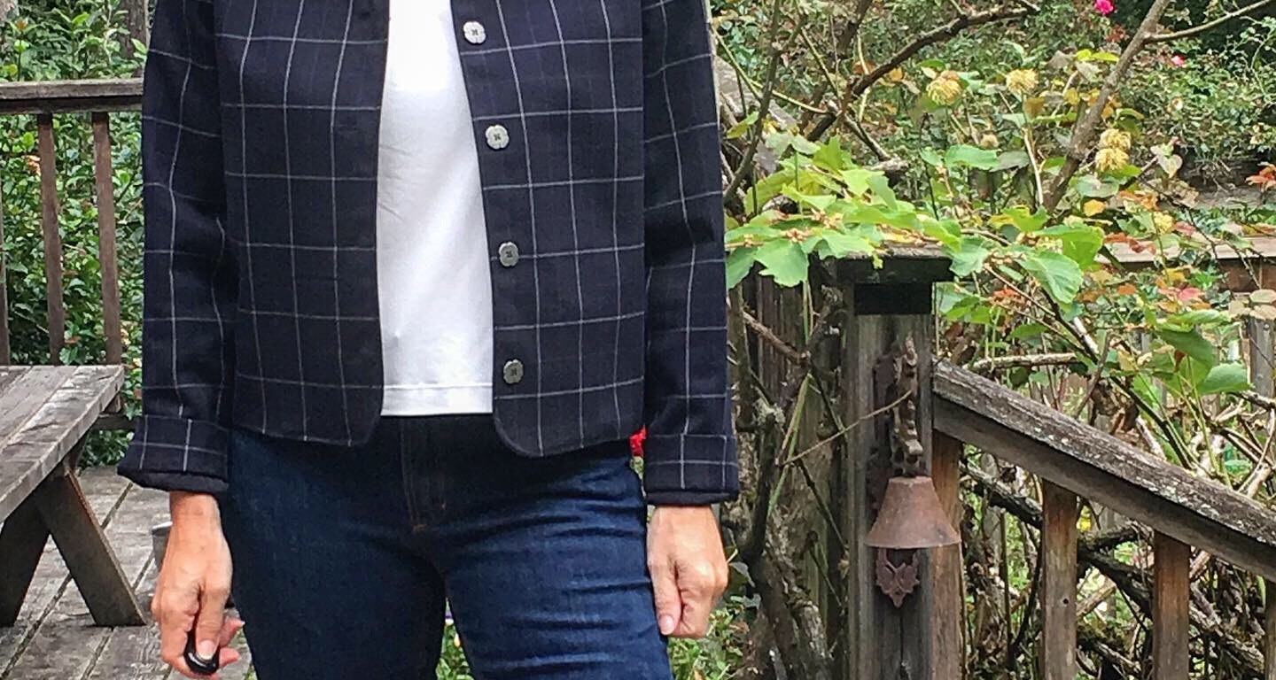 Once I realized how versatile this jacket was, I decided to make my “real” version in a darker fabric for Fall. I’m a sucker for windowpane plaid, so when I saw it an JoAnns in this dark navy heavy suiting, I hoped it would be perfect…and it was! The weight is perfect for the little stand-up collar, and it’s a great weight when lined for fall and spring.